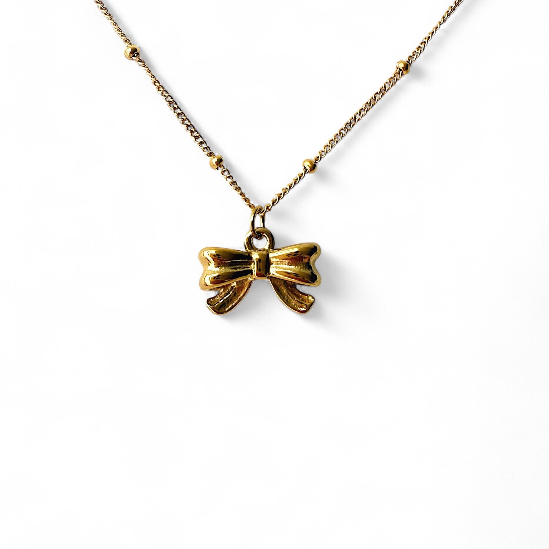 De Bowie ketting is een charmante mix van jeugdigheid en verfijning. De fijne goudkleurige ketting met subtiele bolaccenten draagt een gepolijste strikbedel die een vleugje speelsheid toevoegt aan elke look. Ideaal voor wie houdt van sieraden met karakter en een knipoog naar klassieke vrouwelijkheid.