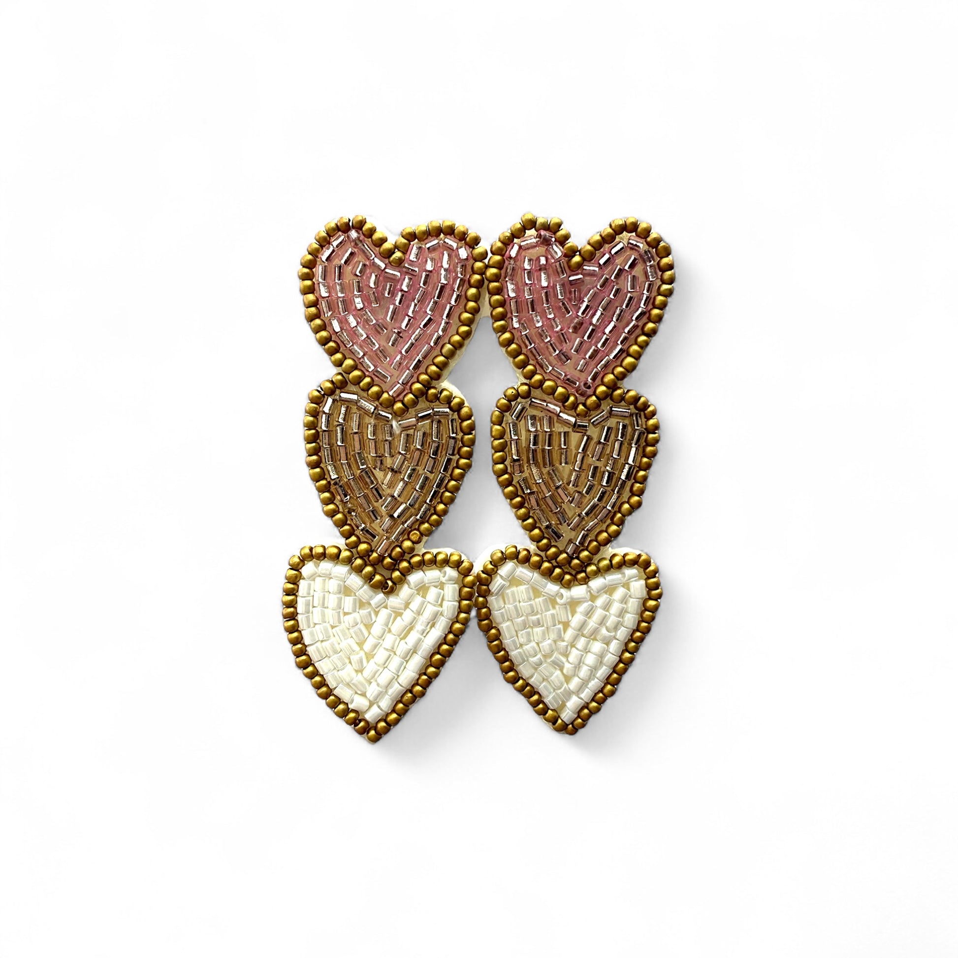 De cascada oorbellen zijn een speelse ode aan kleur en liefde. Drie met de hand geregen harten, in warme tinten van roze, brons en crème, vormen samen een opvallend maar verfijnd statement. Het kralenwerk vangt het licht op een subtiele manier, waardoor deze oorbellen zowel overdag als ‘s avonds stralen. Perfect voor wie haar look wil verrijken met een vleugje boho-chic.