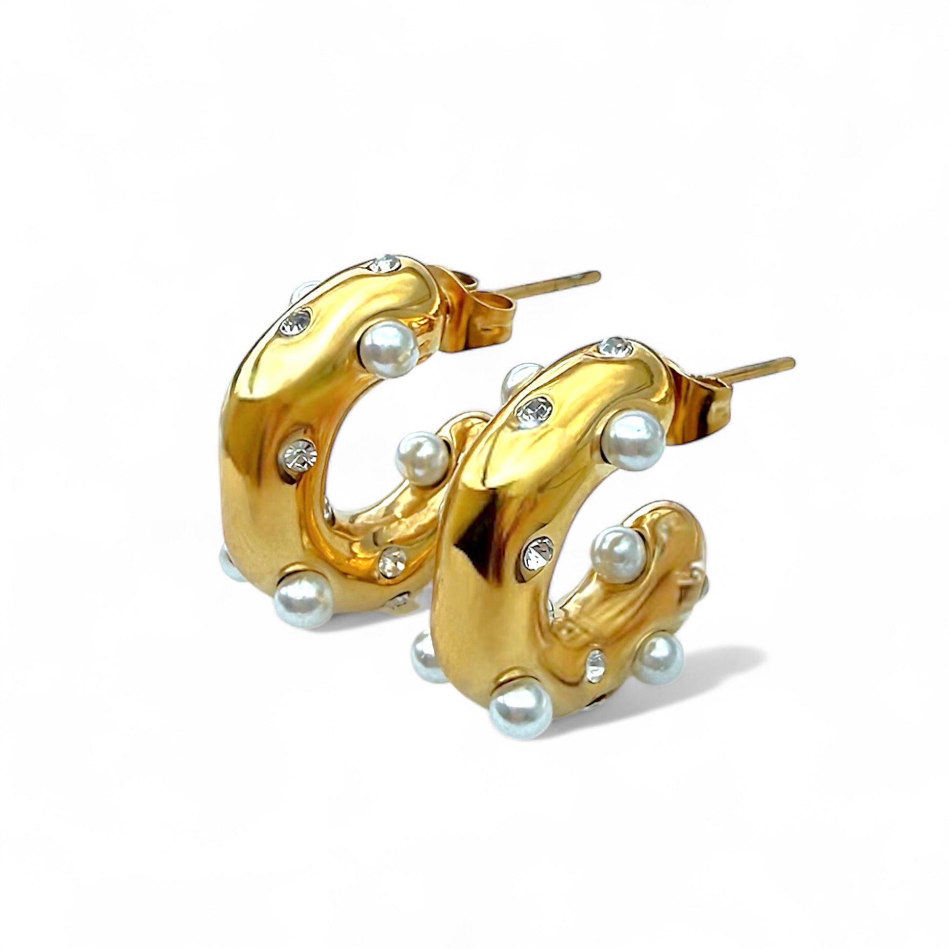 De Celeste oorbellen zijn een schitterend statement van speelse luxe. De glanzende, gouden halfronde vorm is rijkelijk versierd met parels en fonkelende kristallen, die samen een dromerige uitstraling creëren. Perfect om elke look een vleugje high-fashion glamour te geven — van avondjurk tot jeans en blazer.