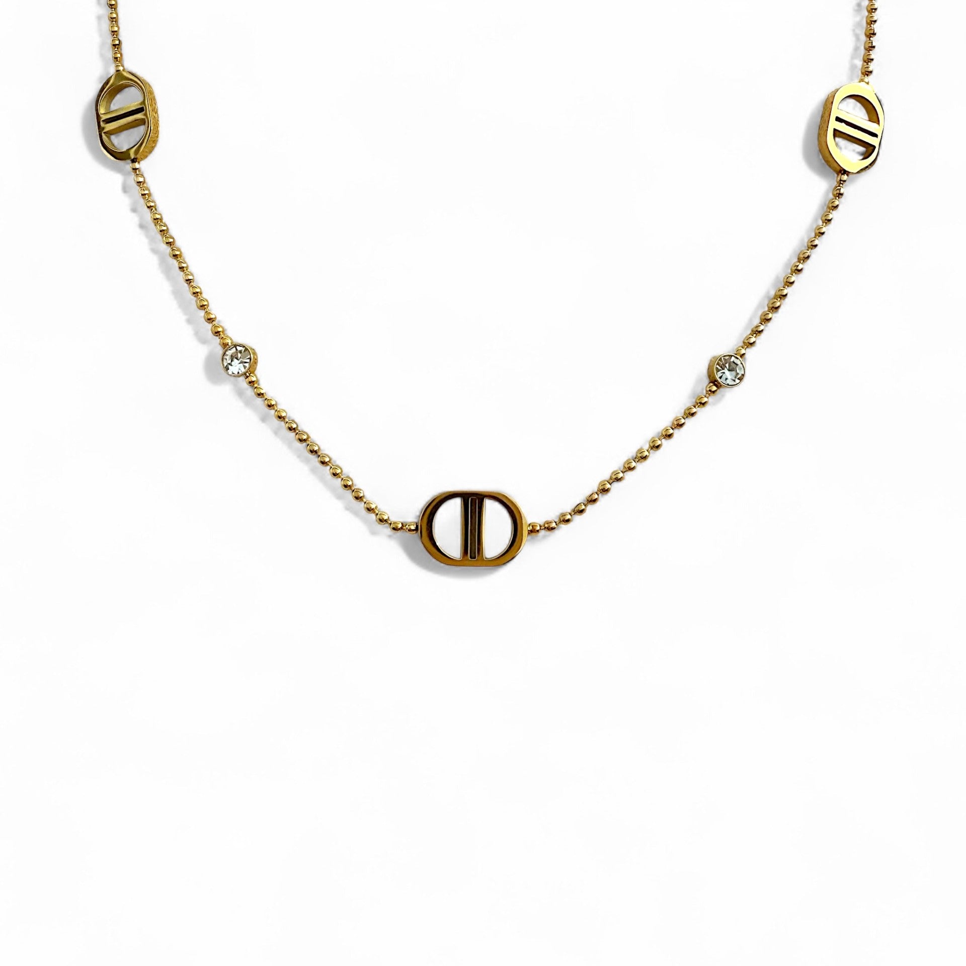 De Diora ketting is een verfijnde ketting die luxe en subtiliteit moeiteloos combineert. De gouden schakels zijn afgewerkt met iconische symbolen en sprankelende zirkonia's, waardoor dit sieraad een tijdloze aanvulling is op elke look. Perfect voor zowel dagelijkse elegantie als speciale gelegenheden.