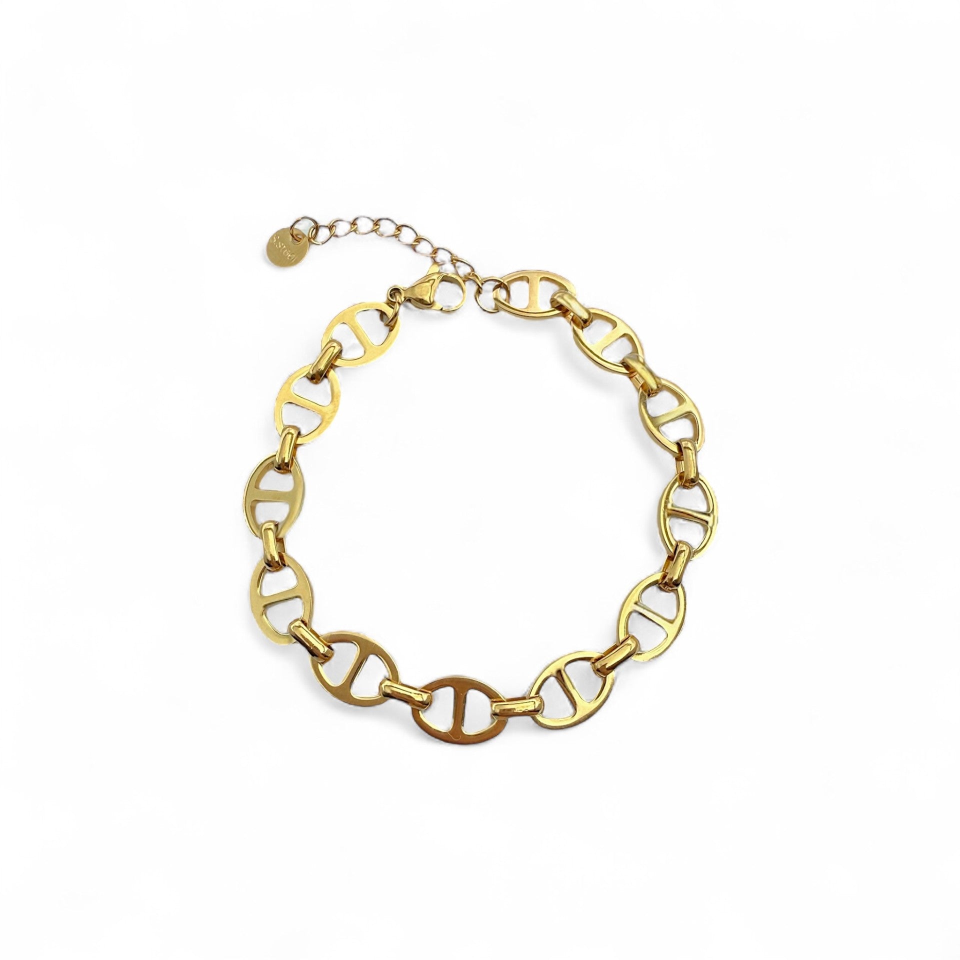 De elena armband is de perfecte balans tussen minimalisme en verfijning. De subtiel opengewerkte schakels creëren een luchtige, elegante look, terwijl de warme gouden glans een luxe uitstraling geeft. Deze armband is moeiteloos te combineren — draag hem solo voor een subtiele touch of stapel hem met andere sieraden voor een gelaagde stijl.