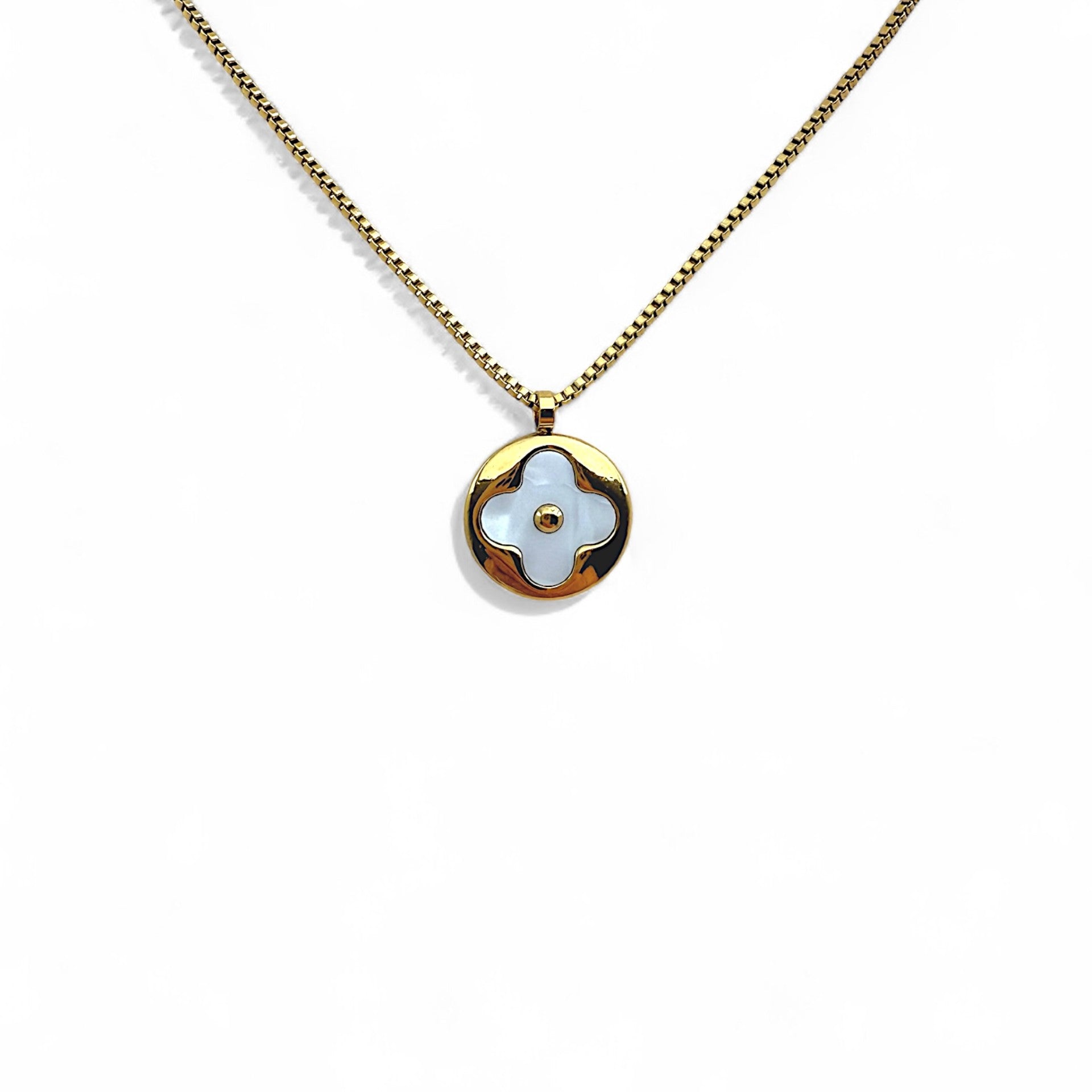 De Jade ketting straalt tijdloze klasse uit met haar ronde hanger, waarin een wit parelmoer bloem subtiel glanst bij elke beweging. Het warme goud en de zachte glans vormen samen een chique en verfijnd geheel dat bij elke gelegenheid past.
