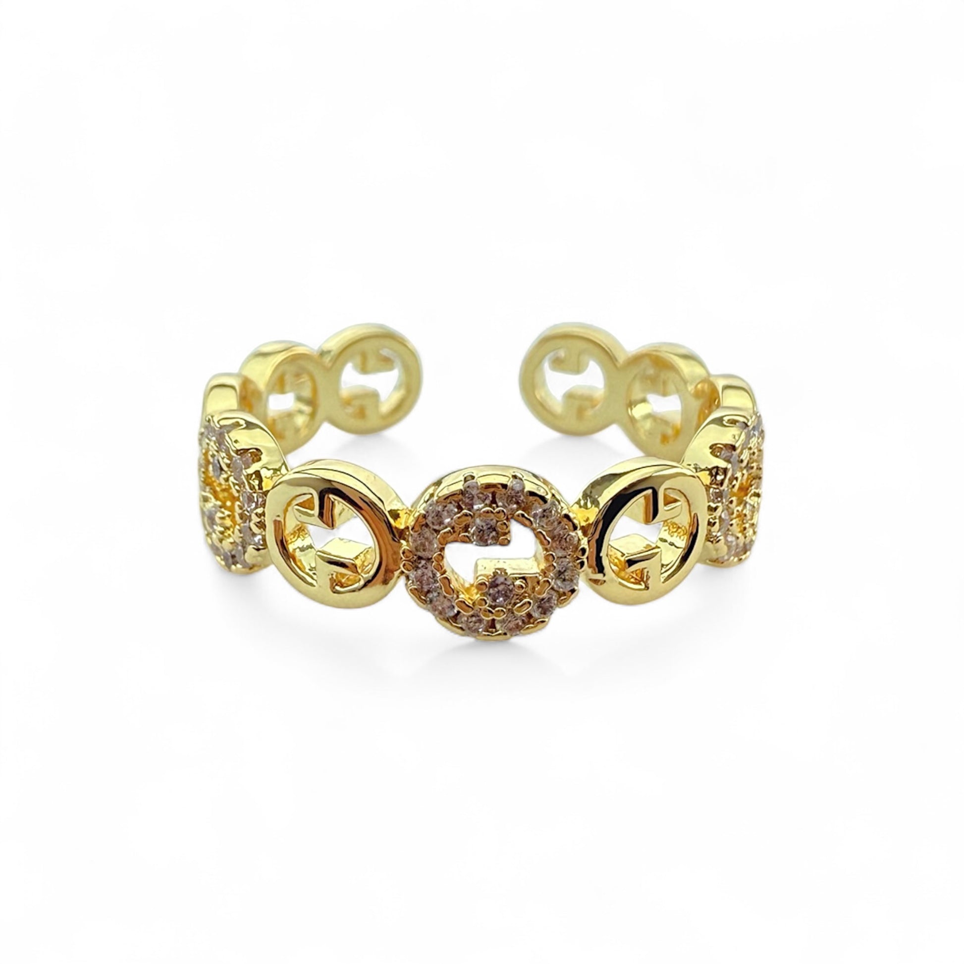 Deze ring is een verfijnde mix van elegantie en statement. Het ontwerp bestaat uit een reeks stijlvolle, opengewerkte schakels die rond de vinger vallen, met in het midden een fonkelend detail bezet met sprankelende steentjes. De symmetrische vormen en de gouden glans geven de ring een luxueuze, tijdloze uitstraling die direct in het oog springt.
