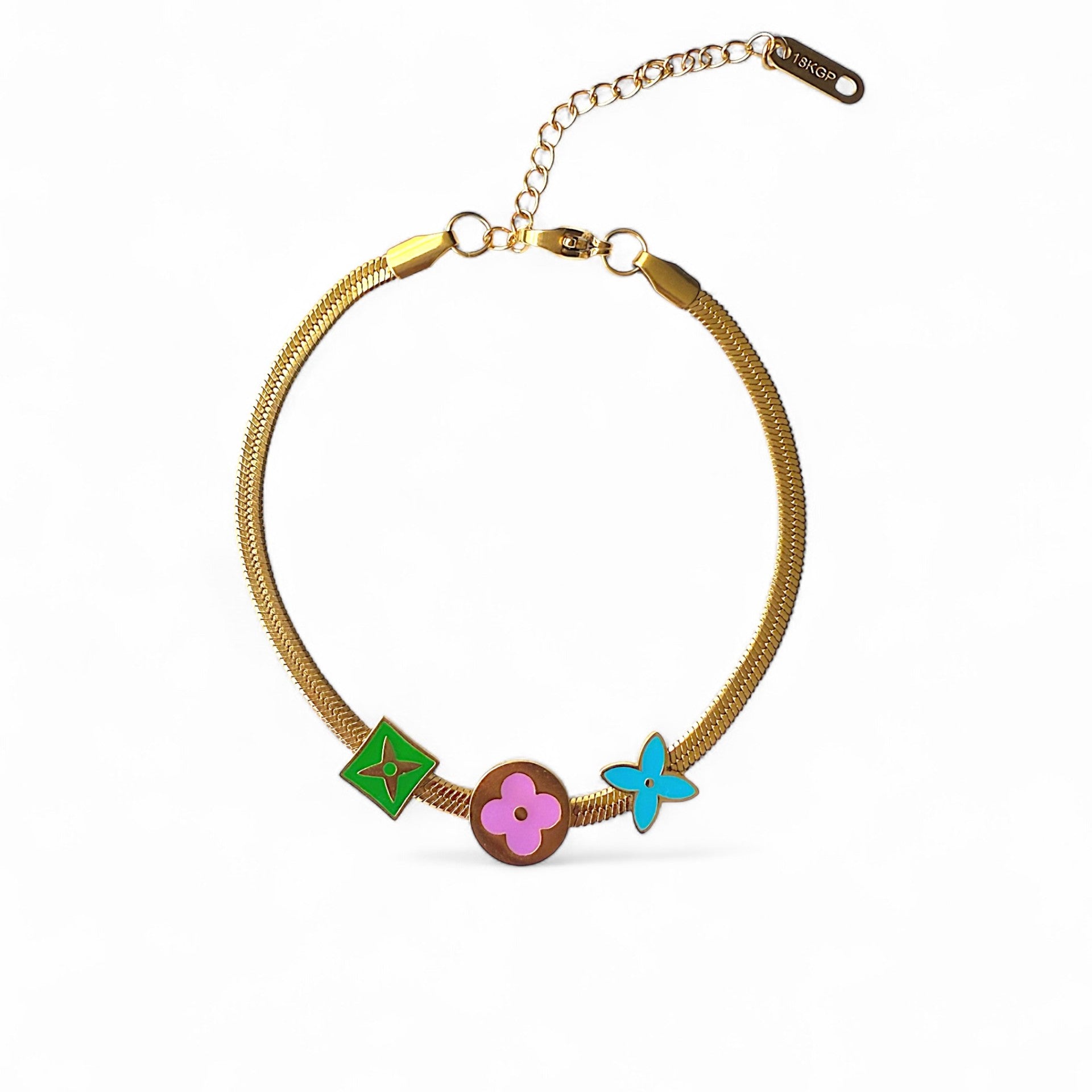 De Nora armband is een speelse en toch elegante armband die direct een vrolijke en luxueuze uitstraling geeft. Het verfijnde, goudkleurige snake chain design wordt verfraaid met drie kleurrijke bedels in levendig groen, zachtroze en helderblauw, elk in iconische bloem- en stervormen. Een perfecte combinatie van speelsheid en stijl. Perfect voor een zomeravond!