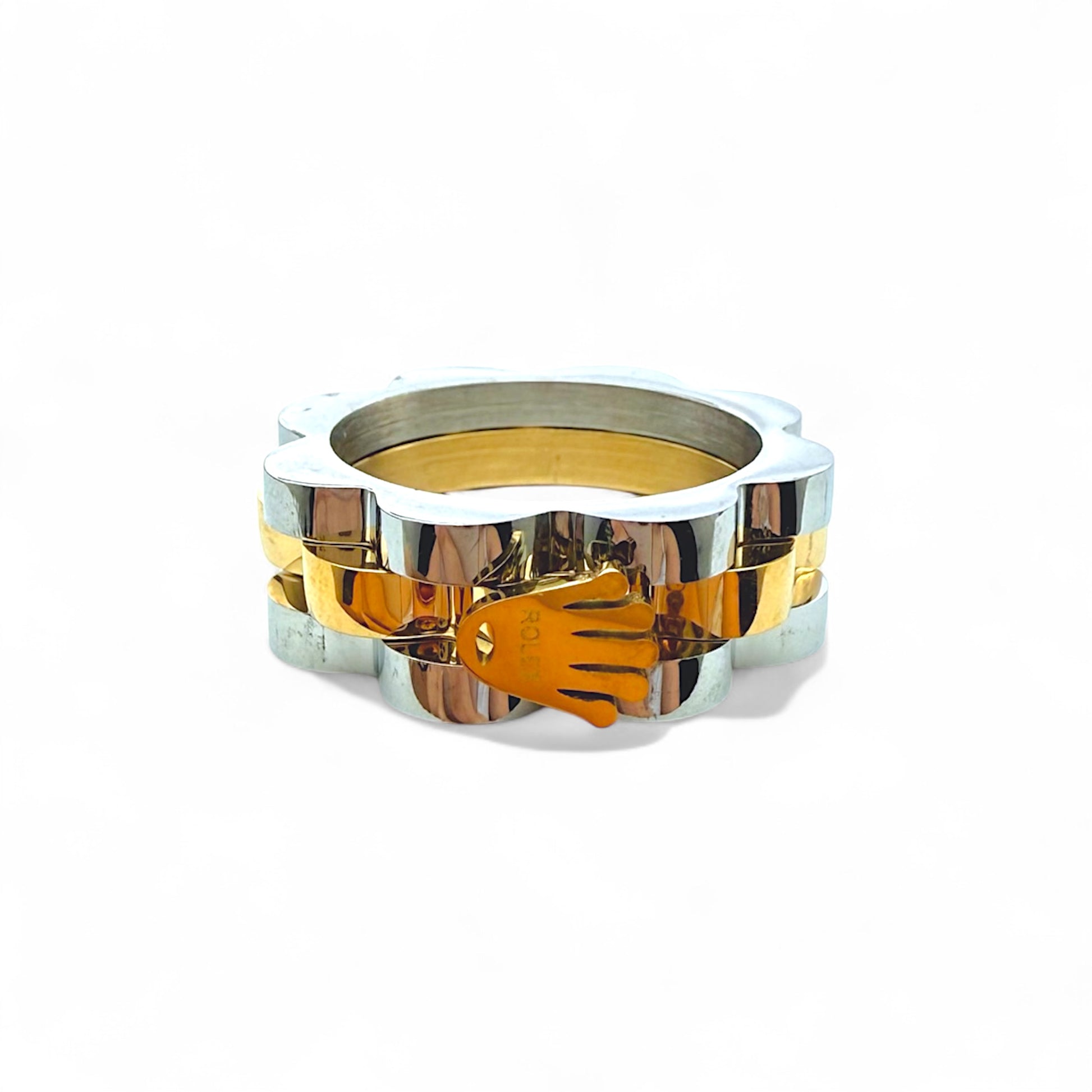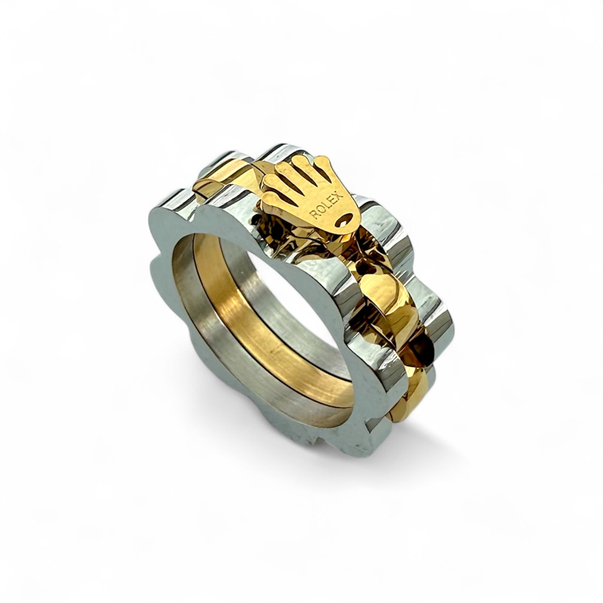 De Roberta ring combineert robuuste elegantie met een iconisch design. De tweekleurige afwerking in zilver- en goudtinten wordt geaccentueerd door de kenmerkende kroon, wat de ring een krachtige en luxueuze uitstraling geeft. Perfect voor wie durft op te vallen.