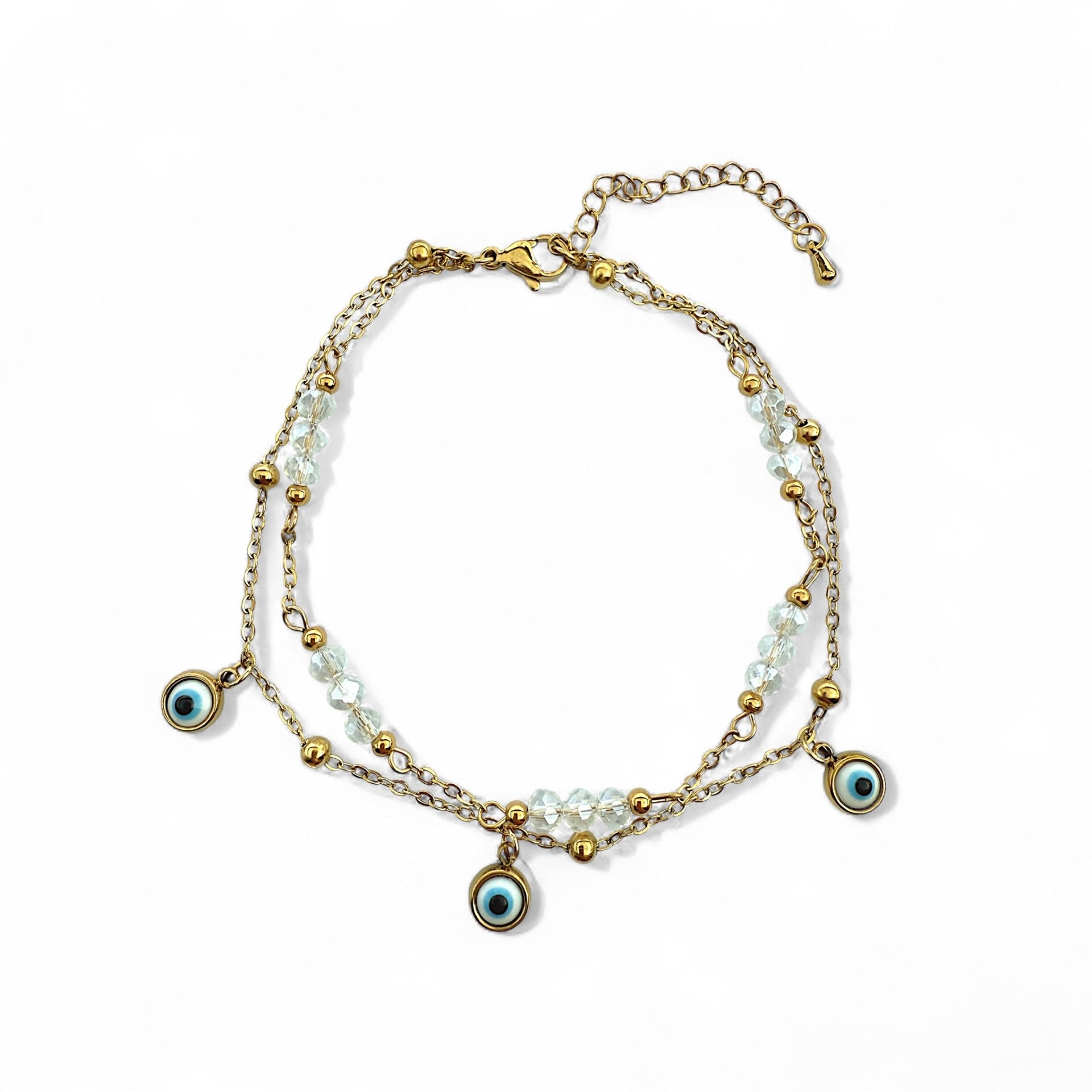 De Selena enkelband is zowel stijlvol als symbolisch. Met haar dubbele laag van fijne goudkleurige schakels en fonkelende facetkraaltjes trekt ze meteen de aandacht. De drie hangende ‘Evil Eye’-bedels in blauw en wit worden al eeuwenlang gezien als talismannen voor bescherming en geluk. Een perfecte mix van betekenis en mode.