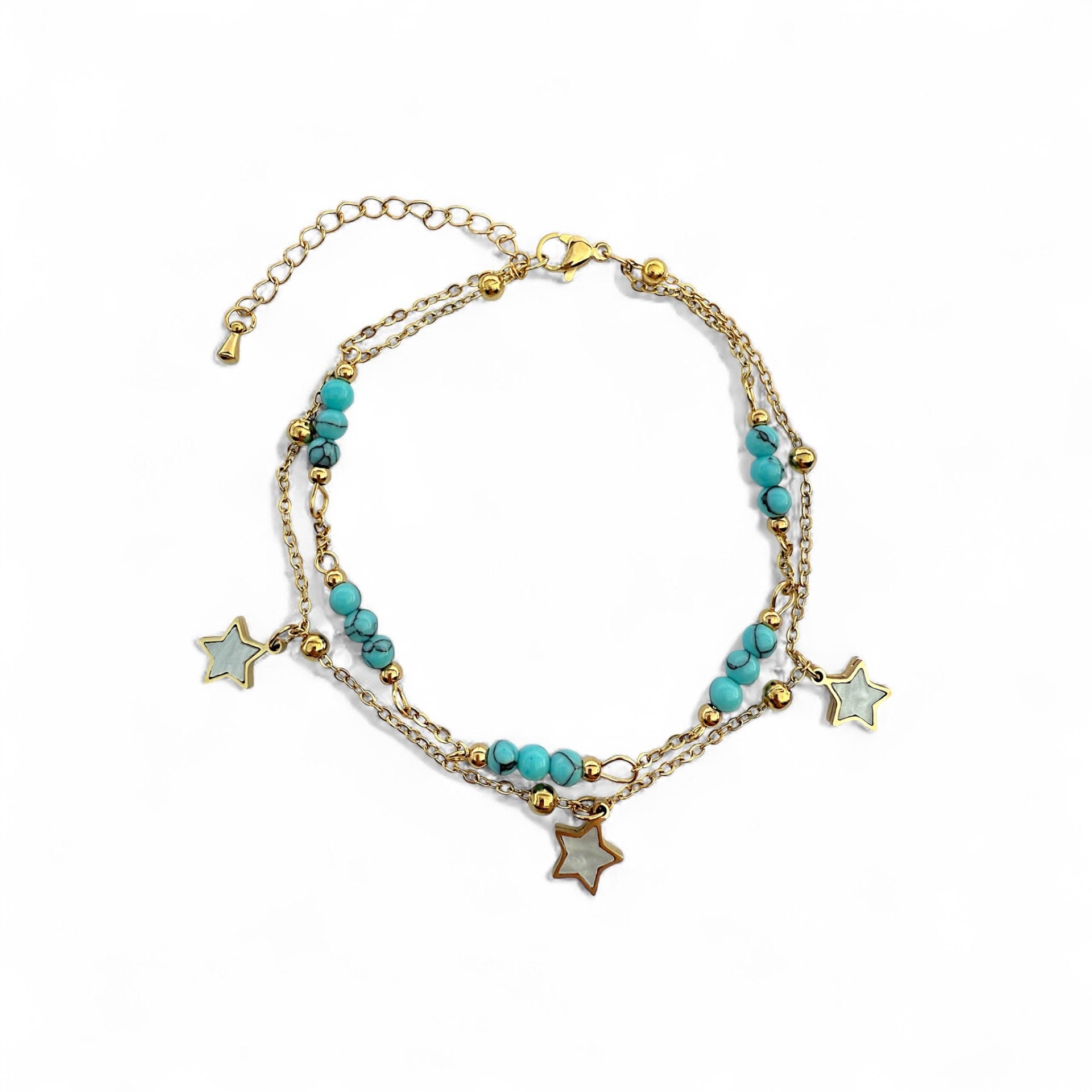 De Stella enkelband straalt een speelse en zomerse vibe uit. Het verfijnde dubbelkettingontwerp wordt verrijkt met turquoise kralen, goudkleurige accenten en drie delicate sterbedels met parelmoer inleg. Een perfecte finishing touch voor blote voeten op het strand of sandalen in de stad.