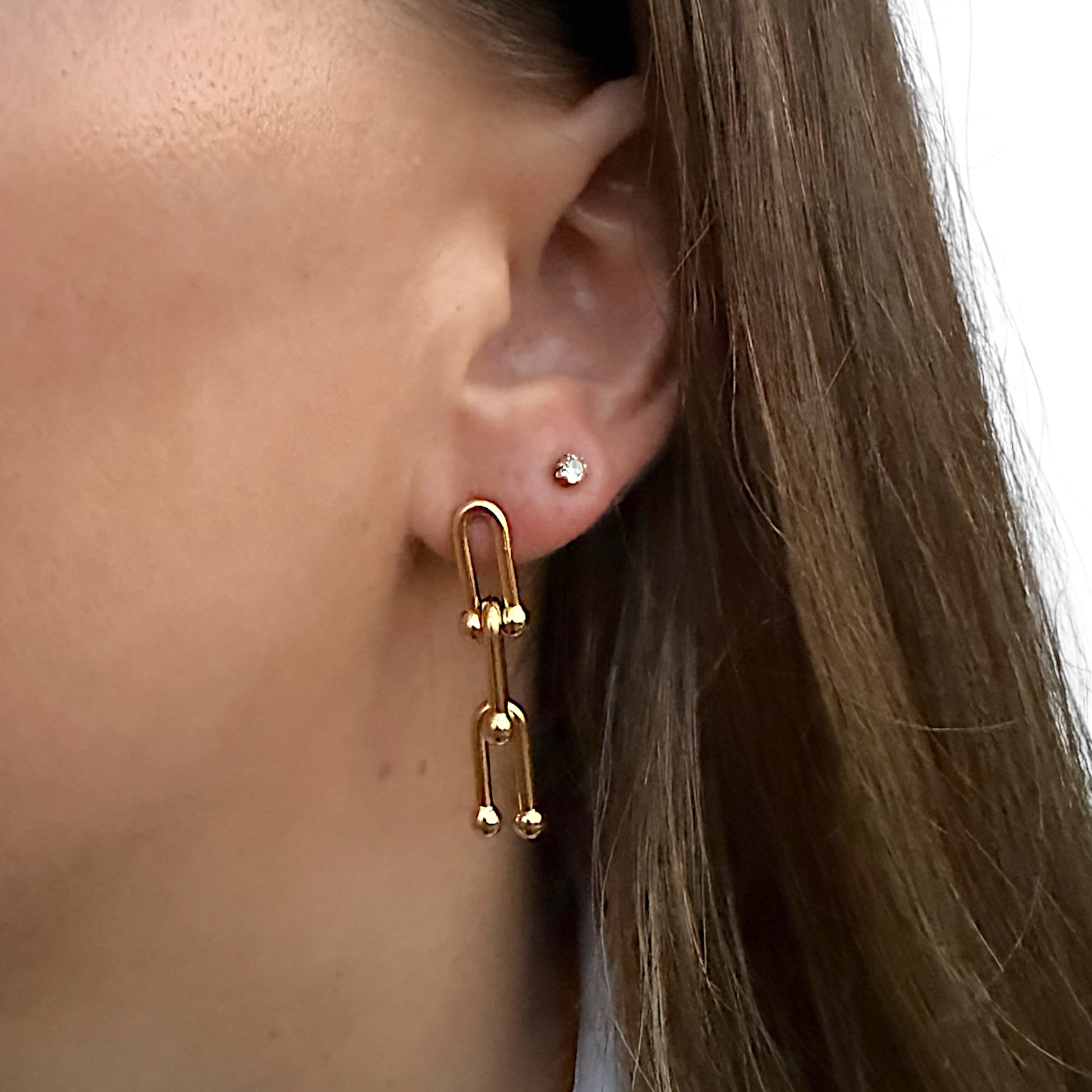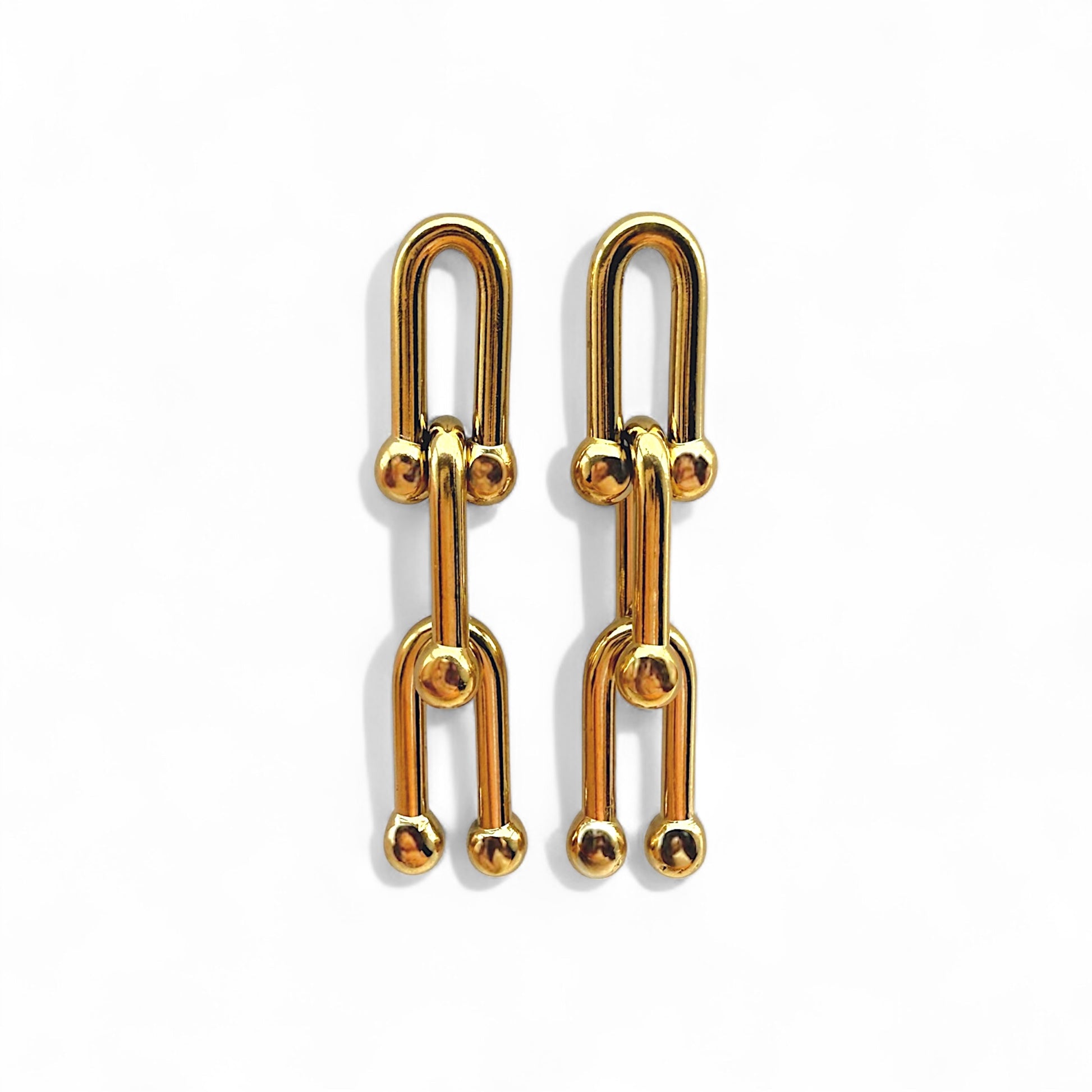 De Yara Oorbellen combineren een strak, minimalistisch design met een opvallend statement. De dubbele schakels in glanzend goudkleurig metaal geven een krachtige en moderne uitstraling. Perfect voor wie houdt van eigentijdse sieraden die moeiteloos van dag naar nacht gedragen kunnen worden.